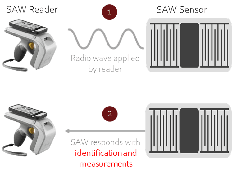 Surface Acoustic Wave works in much the same way. Readers are used to communicate to SAW sensor devices that communicate wireless and without the need for power. The biggest difference is that SAW devices can retrieve environmental, electric, and even chemical information about the environment in which they are installed.